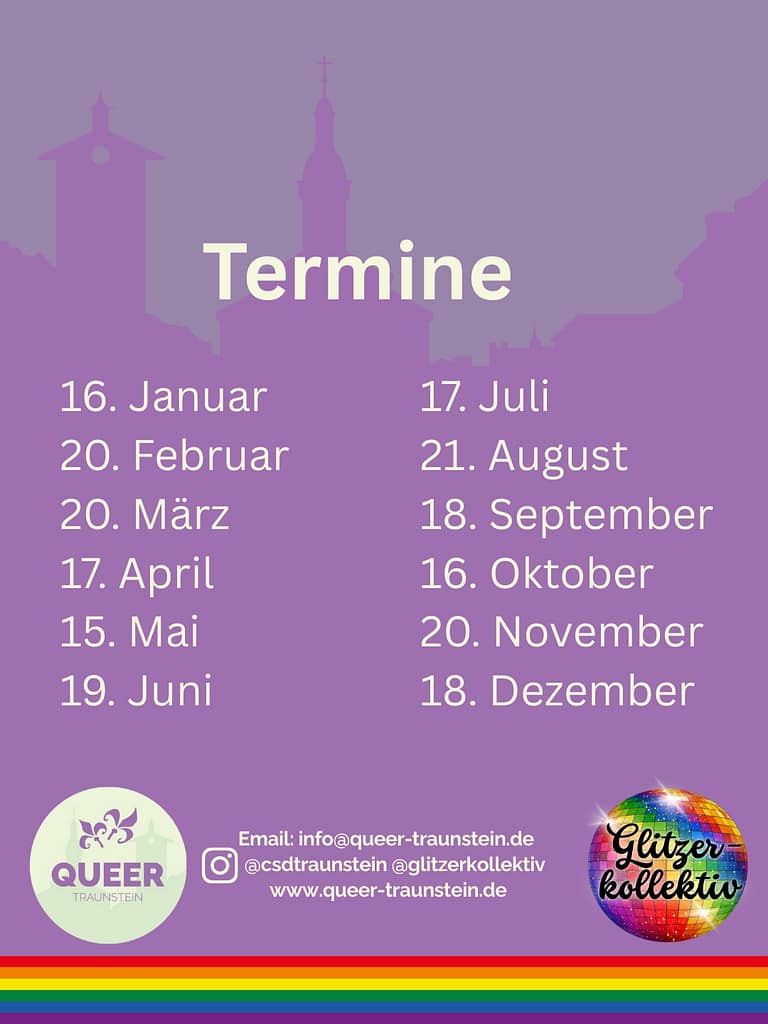 Wir möchten die queere Szene auch im Traunsteiner Nachleben etablieren. Deshalb eröffnen wir mit dem Traunsteiner Glitzerkollektiv einen monatlichen Stammtisch.